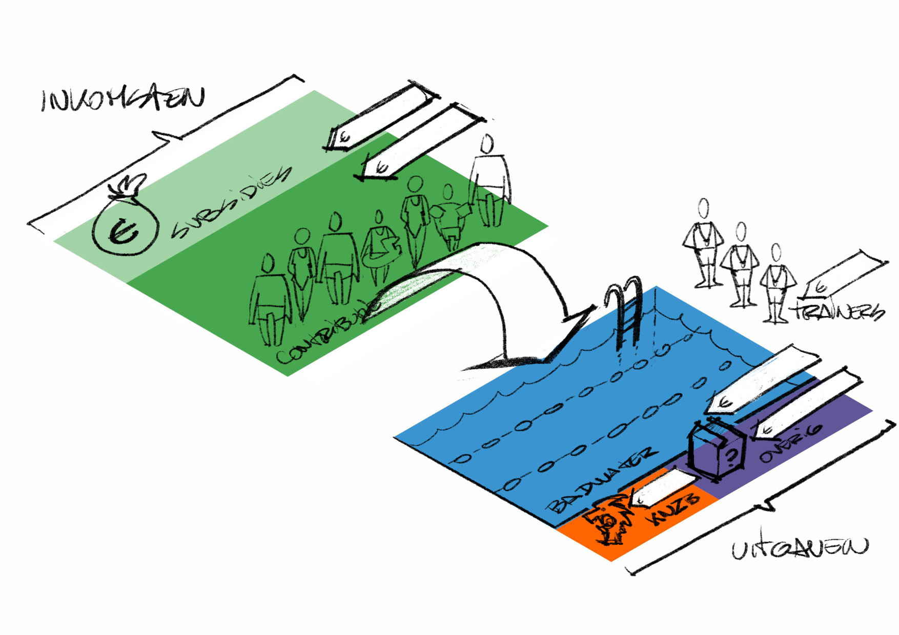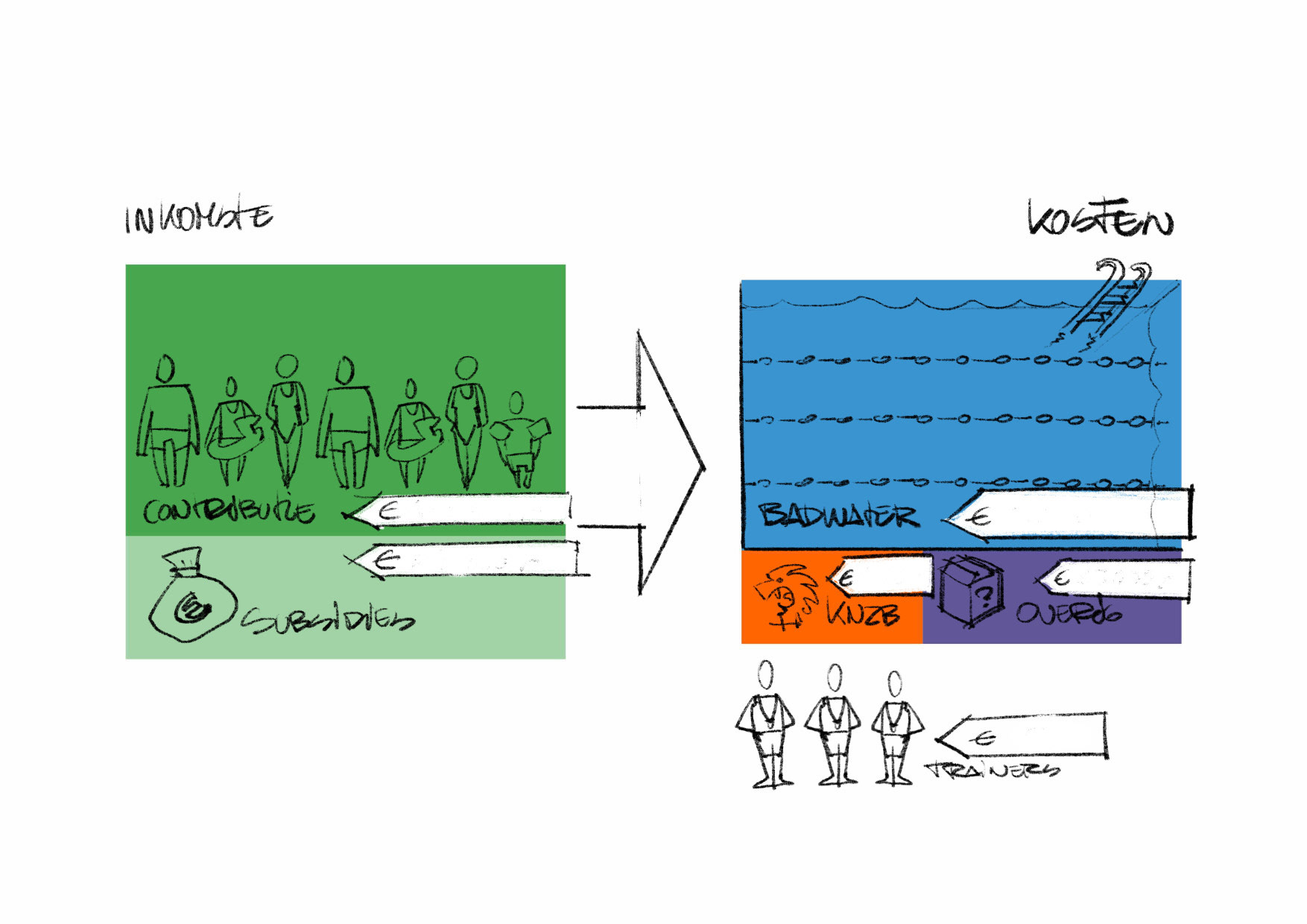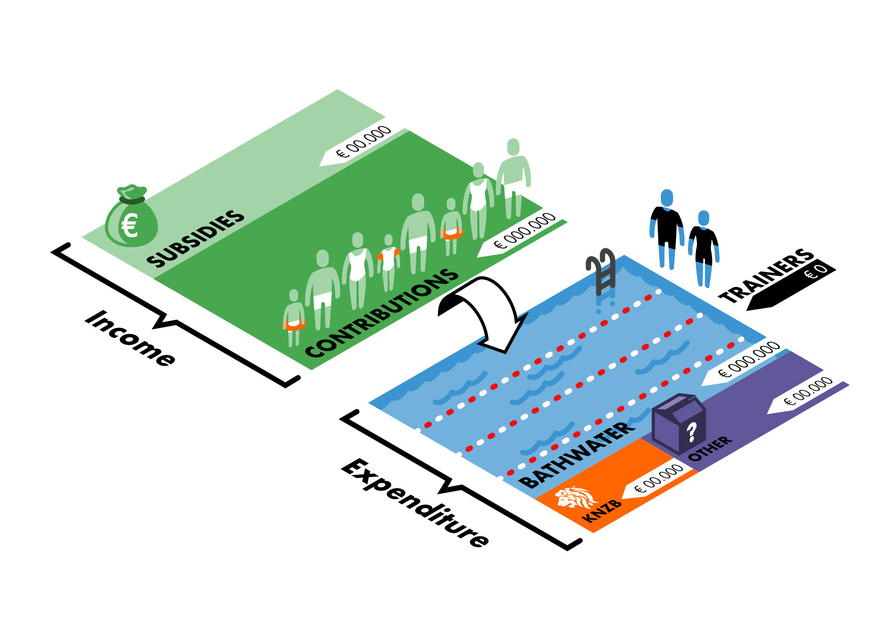 I was approached by a swimming club develop a visual explaining to their members just where their contributions ended up. There was a discrepancy where their members thought the funds where going (the trainers, who are in reality all volunteers and dedicate a significant part of their free time to the club without compensation) and where it actually ended up (majorly the bathwater and the heating thereof).